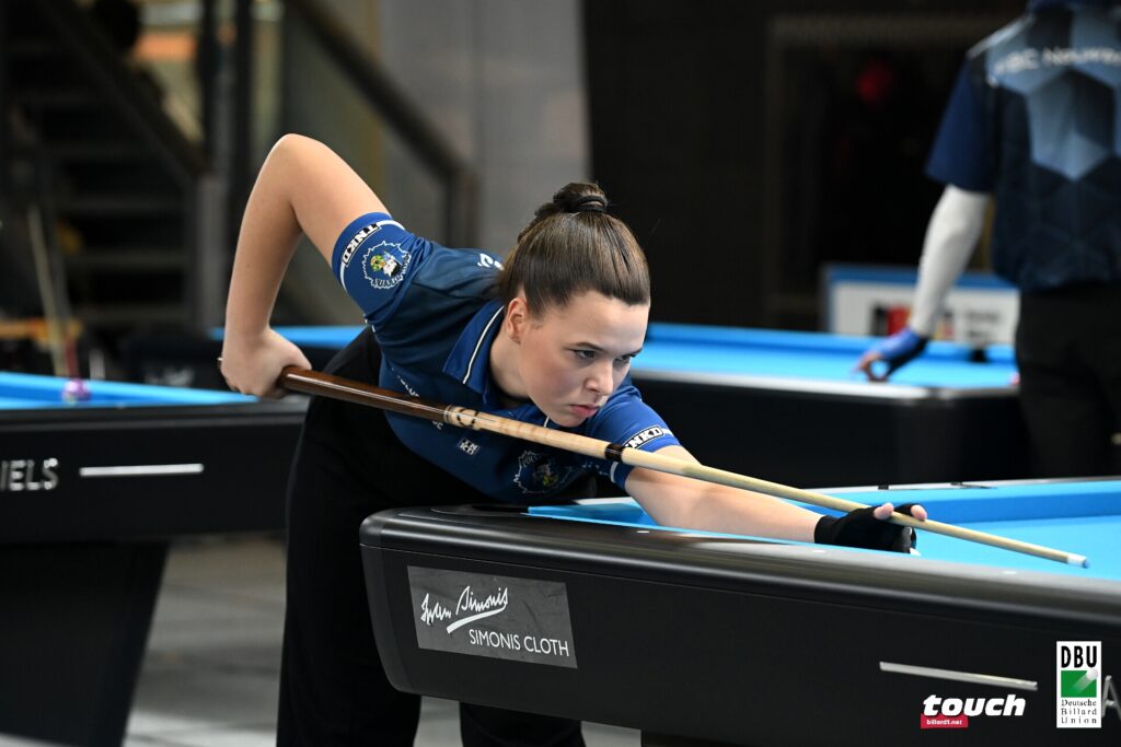 Gar schon im Halbfinale steht Selina Franz von den Pool-Devils Neu-Anspach, die sich bei der weiblichen U18 im Halbfinale gegen die Siegerin des 14/1-Turniers, Lea Marie Bockstegers aus Oberhausen, mit 4:2 durchsetzte.